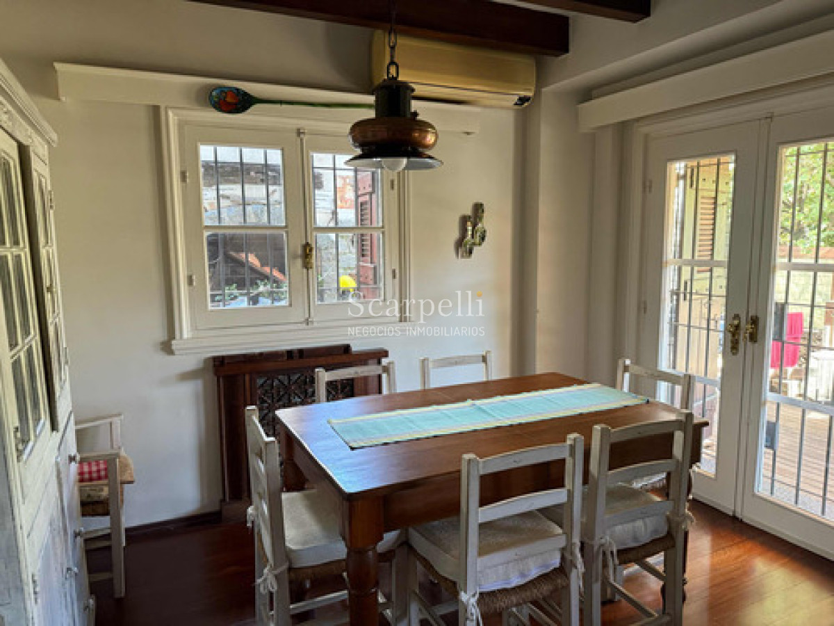 En planta baja mediante la entrada principal se accede a un gran living comedor (10 x 5,50) con piso de cedro y ventana de 4 hojas con doble vidrio. Contiguo se encuentra un gran estar con piso de lapacho y estufa de leña que está semi integrado a un gran comedor diario por el que se permite el acceso al deck (7,60 x 3,80) con agradable vista hacía calle Bvar Artigas. Baño social en impecable estado. Despojador. Cocina amplia con profusión placares, doble mesada de granito negro con doble bacha, desayunador. Se destaca por materiales de primera categoría. Dependencia de servicio completa.